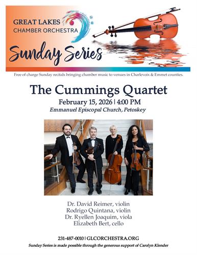 The Great Lakes Chamber Orchestra (GLCO) will present The Cummings Quartet on Sunday February 15 at 4 PM at Emmanuel Episcopal Church, 1020 E. Mitchell St. in Petoskey. The public recital is part of GLCO’s Sunday Series, which features small orchestra ensembles performing free of charge in venues around northern Michigan.